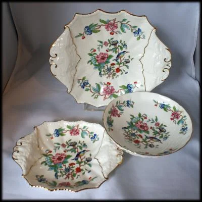 Fine englisch bone china Pembroke reproduction of an eighteenth century Aynsley design Het grote schaaltje is 21 cm bij 18 cm Het kleine schaaltje is 16,5 cm bij 13,5 cm Het ronde schaaltje is 5 cm hoog en heeft een doorsnede van 14 cm