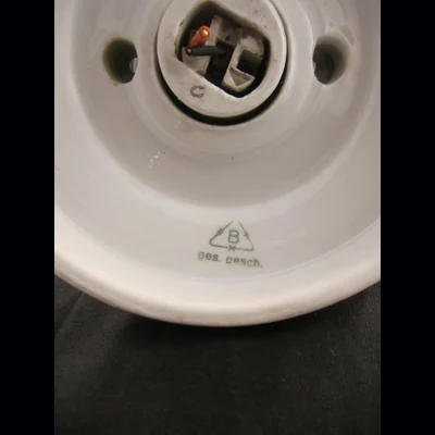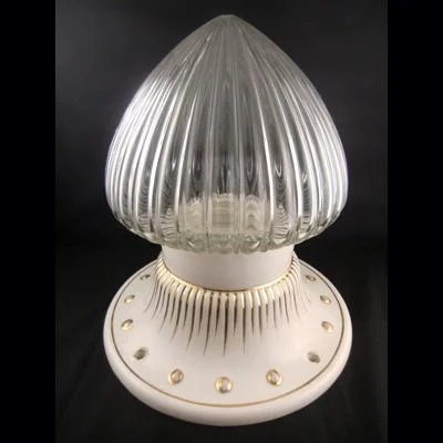 art deco plaffoniere porseleinen voet met goud dekor de glazen kap is van geribbeld pers glas.