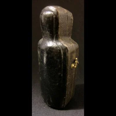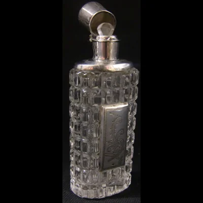 Geslepen flacon met aflsuitbare zilveren dop. gemerkt met hollands zwaardje en een moeilijk te ontcijferen meesterteken. vermoedelijk gemaakt rond 1900