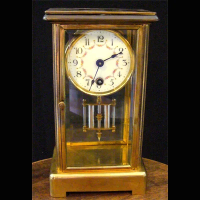 Meer informatie of verzendkosten aanvragenKlokje loopt perfect. Rondom voorzien van geslepen raampjes. Vermoedelijk engels rond 1900.