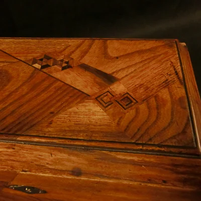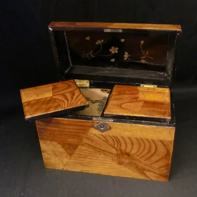 Thee kistje ingelegd met verschillende houtsoorten. voorzien van zilveren sleutelplaat Binnenkant deksel voorzien van bloemdecor.. Twee thee compartimenten met deksel. Engeland ca.1910